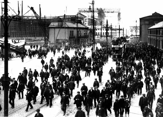 کارگران در حال ترک کارخانه کشتی سازی بلفاست. ساخت تایتانیک در یکی